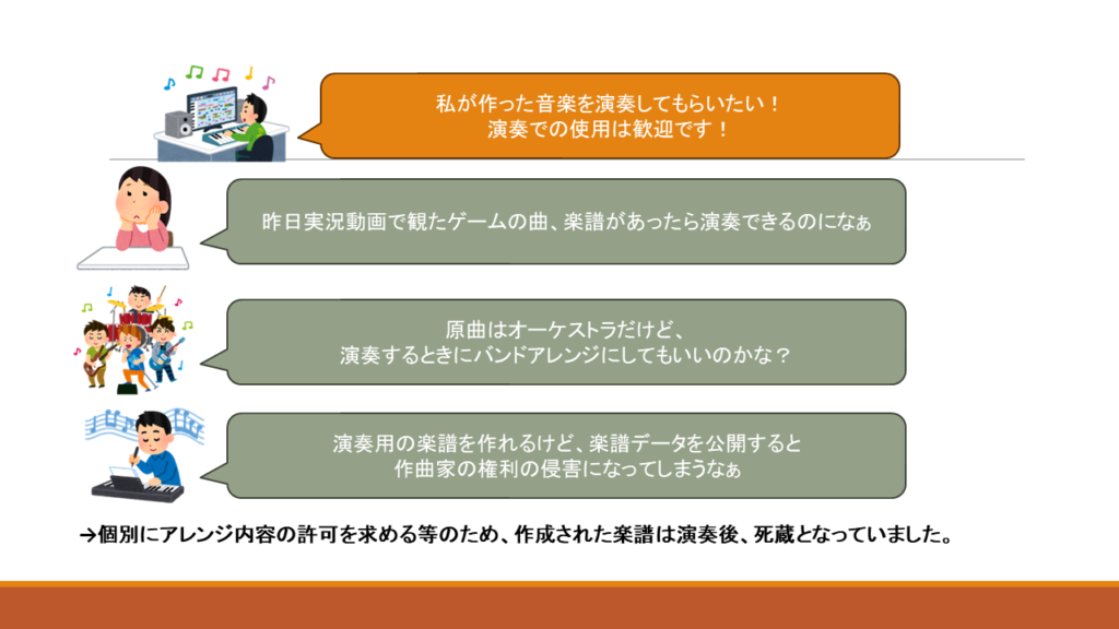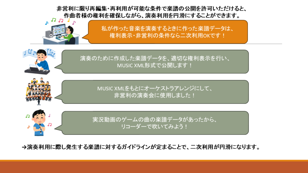もし「自由に演奏をしてもよい」だけがガイドラインにあったとしても、演奏すること、楽譜を作ること、演奏形態に合わせてアレンジすること、演奏の録音を公開することはそれぞれ別の権利にあたるため、楽曲を利用する側にとって、許可された利用形態なのか判断できず、演奏へのハードルが高いままになってしまいます。